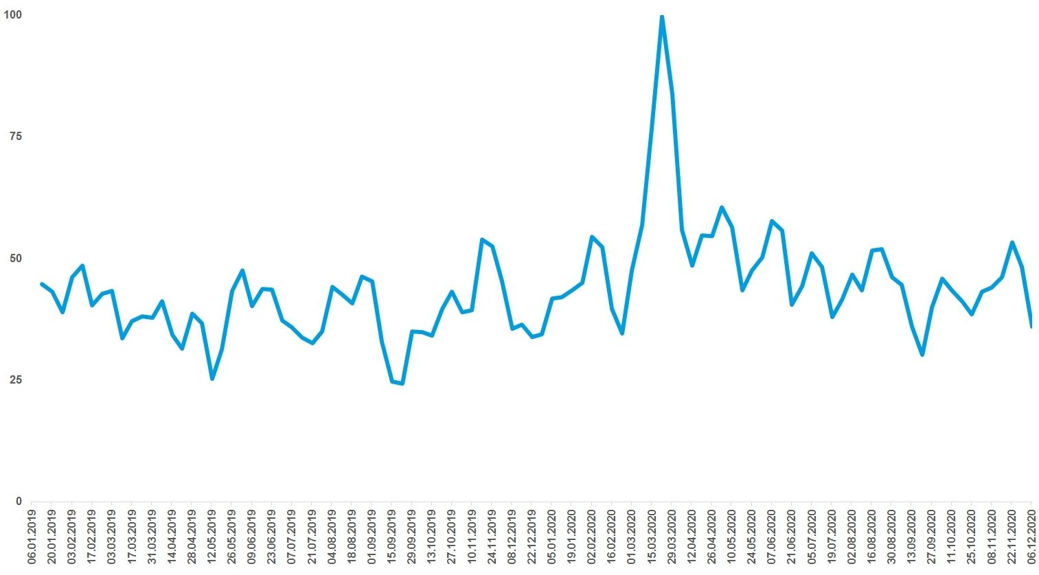 Auch die Situation auf dem Arbeitsmarkt lässt sich mit Echtzeitindikatoren messen. Basierend auf der Abfrage von verschiedenen Google-Suchbegriffen wie zum Beispiel «RAV», «arbeitslos» oder «Arbeitslosengeld» hat das Amt für Wirtschaft und Arbeit einen Arbeitsmarkt-Index für den Kanton Zürich erstellt. Er gibt Anhaltspunkte darüber, ob die Menschen ihre Stelle verloren haben oder ob sie mit einer Entlassung rechnen und korreliert stark mit der Zahl der Stellensuchenden. Nach einem markanten Anstieg solcher Suchabfragen im März gingen diese in den Folgemonaten wieder deutlich zurück und sind seit Sommer relativ stabil. Derzeit ist keine Verschlechterung der wahrgenommenen Arbeitsmarktsituation feststellbar.