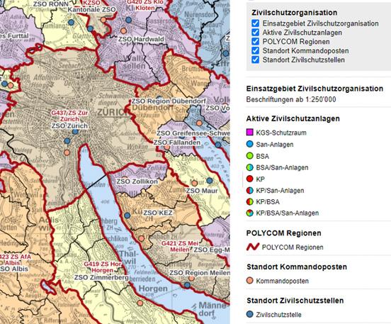 Die dargestellten Einsatzgebiete der Zivilschutzorganisationen werden durch verschiedene Layer mit Informationen über Standorte der Zivilschutzstellen, Kommandoposten, aktive Zivilschutzanlagen sowie die Einteilung der POLYCOM-Regionen (nationales Funksystem der Behörden und Organisationen für Rettung und Sicherheit) ergänzt.