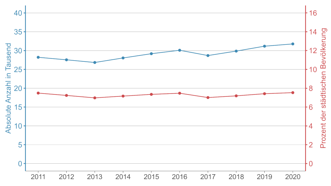 Die zunehmende Zahl der Wegzüge aus der Stadt ist jedoch trügerisch, denn die Bevölkerung der Stadt Zürich ist seit 2011 deutlich gewachsen. Bezieht man die jährlichen Wegzüge auf die gesamte Stadtbevölkerung, ist der prozentuale Anteil der Abwanderungen im Untersuchungszeitraum recht stabil geblieben. Er schwankt zwischen 7.0 und 7.5 Prozent.