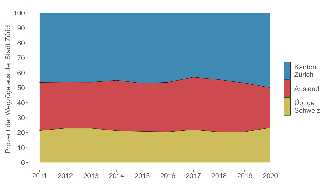 Wohin zieht es die Personen, die der Stadt Zürich den Rücken kehren? In den letzten zehn Jahren verblieb fast die Hälfte der Wegwandernden im Kanton Zürich, etwa ein Drittel wanderte ins Ausland ab und nur ein Fünftel zog in andere Kantone der Schweiz. Allerdings gewinnt der übrige Kanton Zürich seit der Zunahme der städtischen Abwanderung im Jahr 2017 spürbar an Attraktivität. Dagegen wandern deutlich weniger Personen ins Ausland ab. Die Mehrheit der Abwandernden sucht also weiterhin die Nähe zur Stadt Zürich.