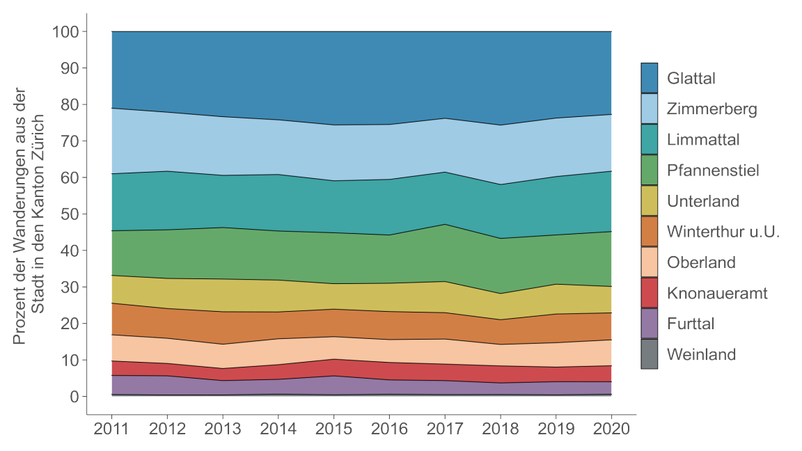 Das Glattal zieht mit einem Anteil von durchschnittlich 24 Prozent die meisten Menschen an. Am anderen Ende steht das Weinland, das weniger als ein Prozent der Wanderungen von der Stadt in den Kanton aufnimmt. Die anderen Regionen liegen dazwischen. Sieht man von kleineren Verschiebungen ab, sind diese Verhältnisse in den vergangen zehn Jahren recht stabil geblieben.