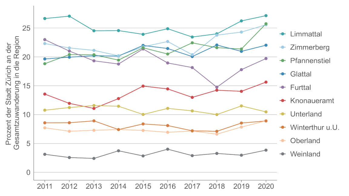 Somit hat die städtische Zuwanderung in fünf von sechs Regionen, die direkt an das Stadtgebiet angrenzen, ein besonderes Gewicht. Die geringste Rolle spielt die Stadt Zürich wiederum im Weinland, wo weniger als fünf Prozent der Zuwanderung aus der Stadt Zürich kommt. Seit 2018 (teilweise schon 2017) nimmt die Bedeutung der Stadt als Herkunftsort jedoch in fast allen Regionen zu, am stärksten im Furttal, im Limmattal und am Pfannenstiel.