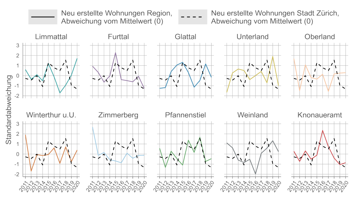 Lesehilfe: Im Jahr 2011 lag die Zahl der neu erstellten Wohnungen im Furttal um etwa eine Standardabweichung über dem regionalen Mittelwert. Gleichzeitig lag die Zahl der neu erstellten Wohnungen in der Stadt Zürich knapp unterhalb des städtischen Mittelwerts. Bild «Liniendiagramm, das für jede Zürcher Region die Anzahl der neu erstellten Wohnungen im Zeitverlauf und im Vergleich mit der Stadt Zürich darstellt. Im Jahr 2019 und 2020 wurde vor allem im Limmattal, Glattal und Unterland intensiver gebaut als in der Stadt. » herunterladen