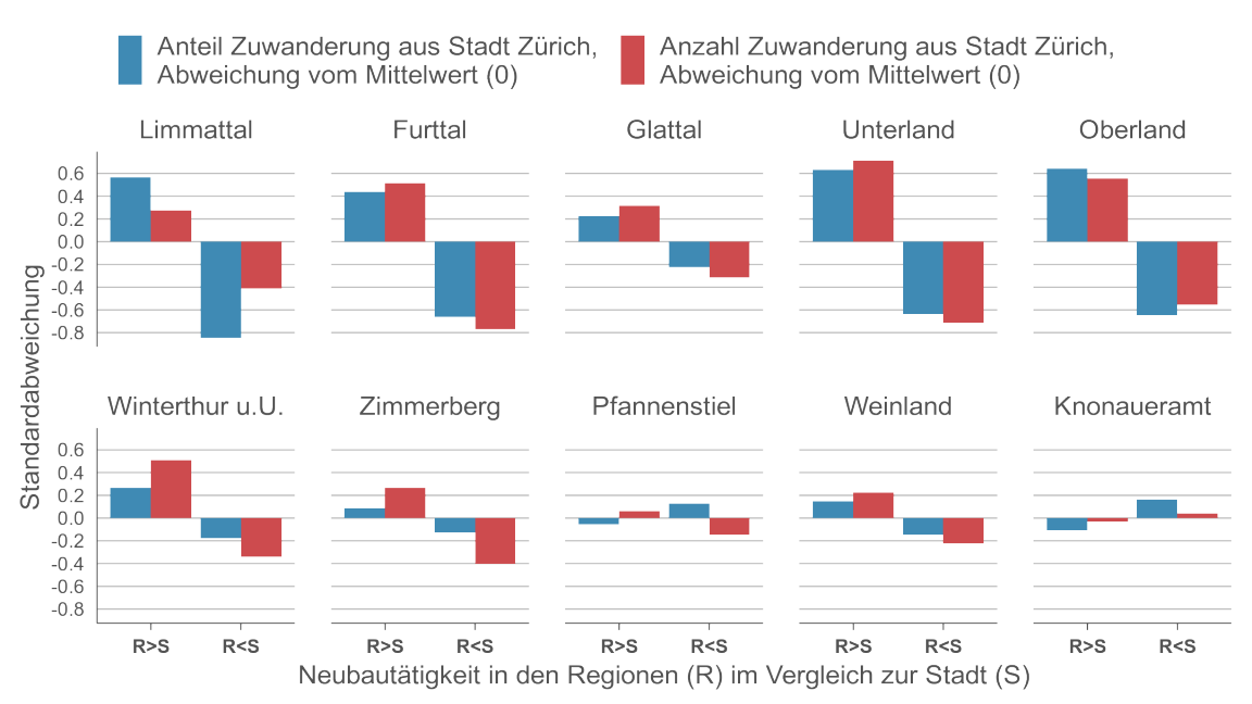 Dieser Zusammenhang ist in den restlichen Zürcher Regionen nur schwach oder gar nicht zu erkennen. Zieht man zusätzlich in Betracht, dass die Wanderungsraten von der Stadt in Richtung Winterthur und Oberland relativ gering sind, sind es vor allem die stadtnahen Gebiete nördlich, westlich und östlich der Stadt Zürich, in denen eine Steigerung der Neubautätigkeit mit einer erhöhten Zuwanderung aus der Stadt einhergeht.