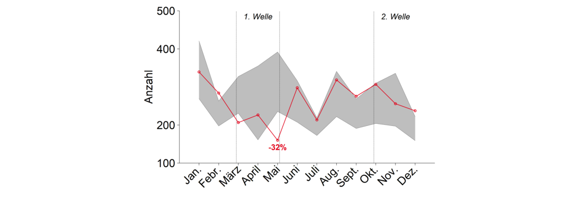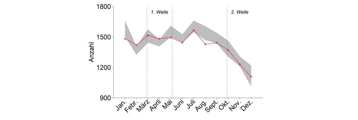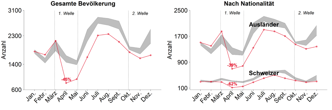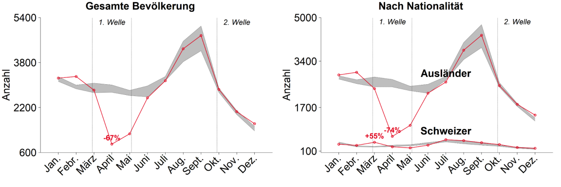 Der Einfluss der Pandemie auf die Todesfälle variierte erheblich zwischen den zwei Infektionswellen. Verglichen mit der Bandbreite in den Vorjahren gab es während der ersten Welle von Mitte März bis Mitte Mai keine markant erhöhte Sterblichkeit (nachfolgend als Übersterblichkeit bezeichnet). Der strikte Lockdown scheint gewirkt zu haben.