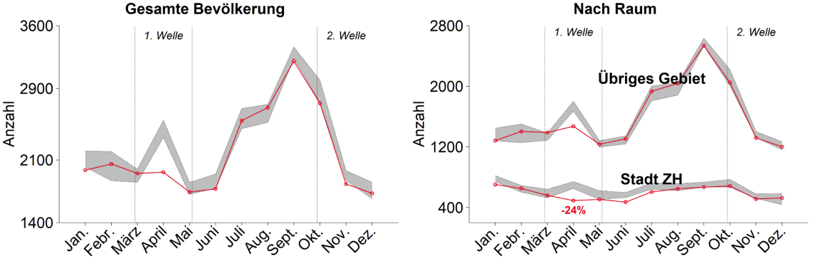 Die zweite Infektionswelle ab Oktober war intensiver, mit täglich mehr als tausend positiv getesteten Personen (gegenüber maximal 200 in der ersten Welle). Sie wirkte sich dementsprechend auch stärker auf die Zürcher Demografie aus: Im November und Dezember 2020 zeigte sich eine Übersterblichkeit von bis zu 69%, die ausschliesslich über 64-jährige Personen betraf. Damit ist der Kanton Zürich im Vergleich zur Genferseeregion oder zum Tessin noch glimpflich davongekommen. Gemäss dem Bundesamt für Statistik war dort die Übersterblichkeit bereits in der ersten Welle markant und in der zweiten Welle teilweise grösser als im Kanton Zürich.