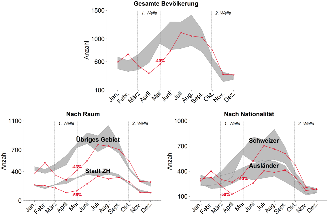 Die Übersterblichkeit war in der Stadt Zürich weniger ausgeprägt als im übrigen Kantonsgebiet. Es ist möglich, dass die städtischen Rentnerinnen und Rentner wegen der räumlichen Nähe existenzieller Dienstleistungen und Einkaufsmöglichkeiten länger selbständig wohnen und einen Übertritt ins Alters- oder Pflegeheim (wo das Ansteckungsrisiko höher ist) aufschieben können. Räumliche Unterschiede bei der sozioprofessionellen Struktur in dieser Altersgruppe könnten aber ebenfalls eine Rolle spielen. Es gibt keine markanten Unterschiede in der Übersterblichkeit zwischen den Personen mit einem ausländischen Pass und den Schweizer Bürgern und Bürgerinnen.