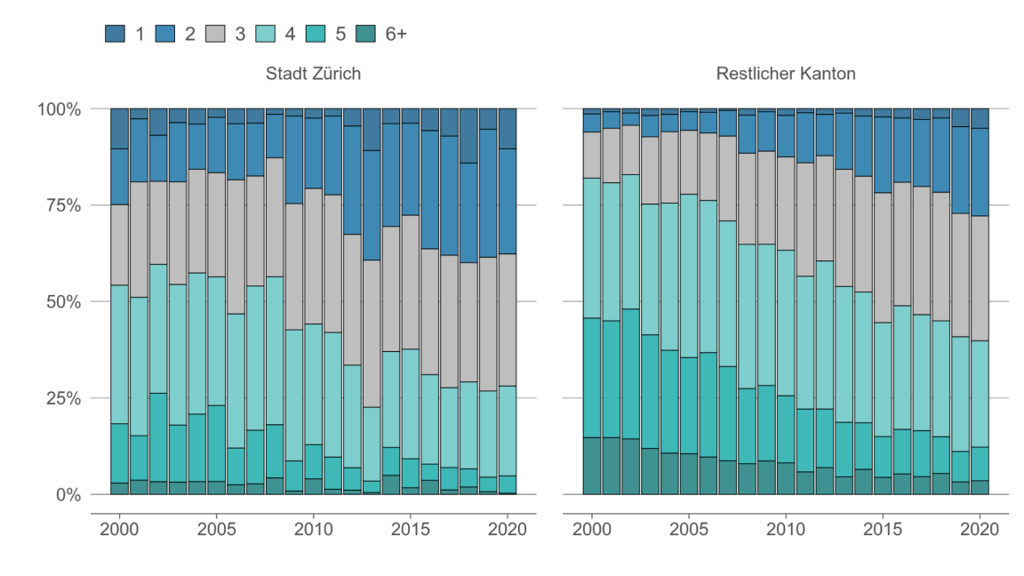Für das Bevölkerungswachstum ist jedoch nicht nur die Zahl der neuen Wohnungen relevant, sondern auch deren Grösse. Je mehr Zimmer eine Wohnung hat, desto mehr Menschen können darin wohnen. In den letzten 20 Jahren ging der Trend bei der Wohnbautätigkeit hin zu Wohnungen mit weniger Zimmern. In der Stadt Zürich ist er zwar schwächer ausgeprägt als im restlichen Kantonsgebiet, aber ebenfalls klar vorhanden. Noch in den Nullerjahren hatte regelmässig mehr als die Hälfte der neu erstellen Wohnungen mindestens vier Zimmer. In den vergangenen fünf Jahren war dies hingegen nur noch bei etwas weniger als 30 Prozent der Wohnungen der Fall. Weil die Personenbelegung von Neubauwohnungen in der Stadt im gleichen Zeitraum ebenfalls zugenommen hat, bleibt der Zusammenhang von Wohnungsgrösse und Bevölkerungsentwicklung zwar nicht konstant über die Zeit, grundsätzlich gilt aber, dass im Schnitt eine neue Wohnung weniger Wohnraum schafft also noch vor 20 Jahren.