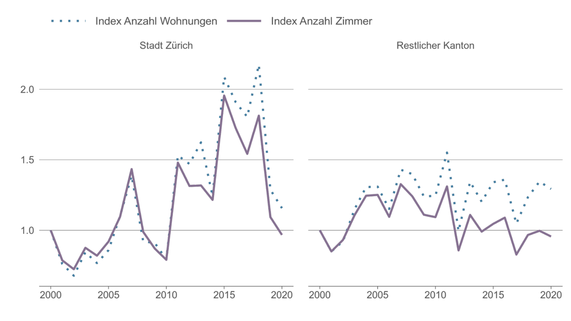 Der Trend zu kleinen Wohnungen führt dazu, dass sich die Entwicklung der Wohnbautätigkeit je nach Messgrösse unterschiedlich präsentiert. In der untenstehenden Grafik erfasst die gepunktete blaue Linie die Bautätigkeit anhand der Summe aller Wohnungen in Neubauten, die violette Linie anhand der Summe aller Zimmer in den Neubauwohnungen. Beide Linien sind auf das Jahr 2000 indexiert.