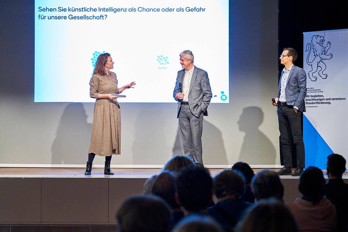 Durch den Abend führte SRF-Moderatorin Kathrin Hönegger. Sie startete den Abend mit einem kurzen Interview mit Christoph Hiller, Gemeindepräsident von Meilen, und der Frage, welche Bedeutung künstliche Intelligenz für die Gemeinde heute bereits hätte. Christoph Hiller erzählte von deren Einsatz im Steueramt und dass es wichtig sei die Technologie dahinter zu verstehen, deshalb auch der heutige Dialog. Im anschliessenden Gespräch mit Fabian Streiff, Leiter der Standortförderung, wurde die Frage aufgenommen, ob künstliche Intelligenz eine Chance oder Gefahr sei. Auch das Publikum war hier gefragt: 76 Prozent gaben in einem Online-Voting an, dass künstliche Intelligenz eine Chance für unsere Gesellschaft ist, lediglich 24 Prozent sehen darin eine Gefahr.