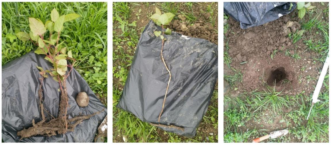 Ungefähr 3 Wochen später, haben die Pflanzen eine Höhe von 20- 40 cm erreicht und waren genug stabil um sie auszugraben. Dennoch reissen die einzelnen Pflanzenteile bei trockenem Boden sehr leicht vom Ursprungsrhizom ab, weshalb die Bekämpfung immer unter feuchten Bedingungen erfolgen sollte. Am 09.06.2020 war der Boden feucht und die Pflanzen genug stabil, sodass Christine die Knöteriche an einem Stück ausgraben konnte.