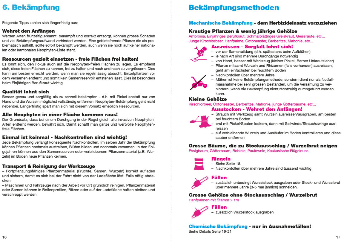 Wir haben versucht, die Bekämpfungsempfehlungen möglichst einfach und einheitlich zu halten. Bei den Artenportraits wurden dann manchmal noch spezifische Tipps zu einzelnen Art ergänzt. Ansonsten bitte jeweils die Tipps auf Seite 16-17 beachten.