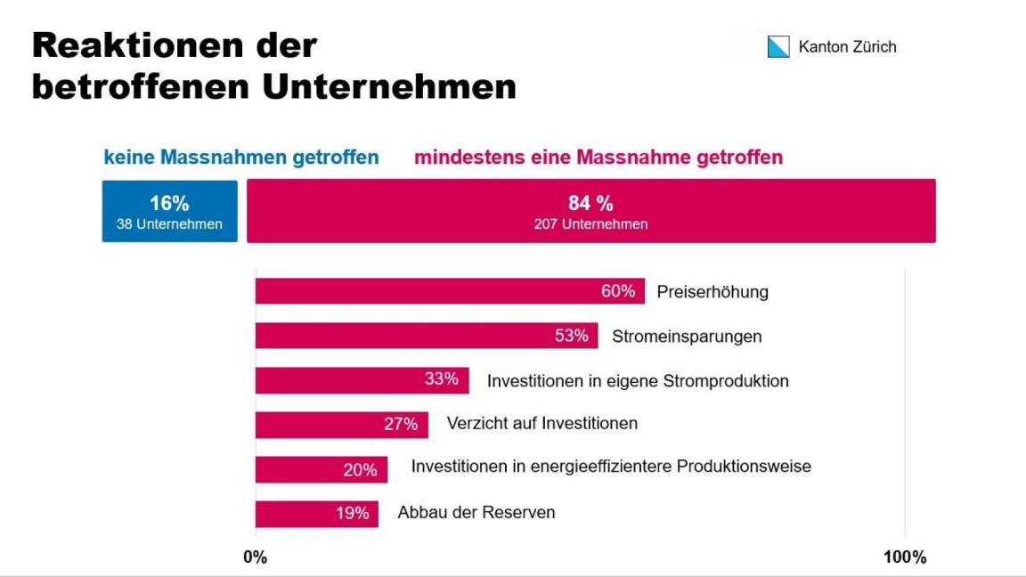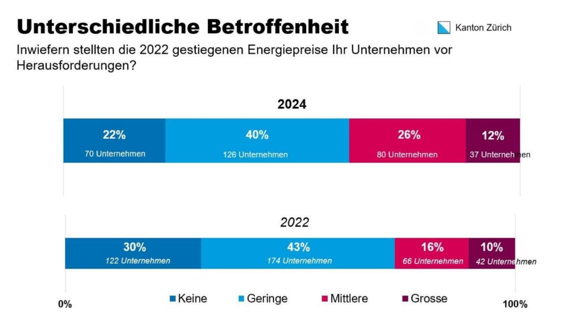 Im Herbst 2022 führte die kantonale Volkswirtschaftsdirektion eine Umfrage durch, um die Auswirkungen der drohenden Energiemangellage und der dadurch stark gestiegenen Energiepreise zu ermitteln. Sie wollte herausfinden, wie stark die Unternehmen von den steigenden Preisen betroffen waren. Unterstützt wurde die Umfrage durch die Zürcher Handelskammer, den KMU- und Gewerbeverband Kanton Zürich, HotellerieSuisse Zürich und Region, den Industrie-Verband Zürich sowie Gastro Kanton Zürich. Die Verbände leiteten den Fragebogen an ihre Mitgliedsfirmen weiter, worauf über 400 Antworten eingingen. Damals zeigte sich die Tendenz, dass nur ein kleiner Teil der Zürcher Unternehmen aufgrund der hohen Energiepreise vor substanziellen Schwierigkeiten steht.
