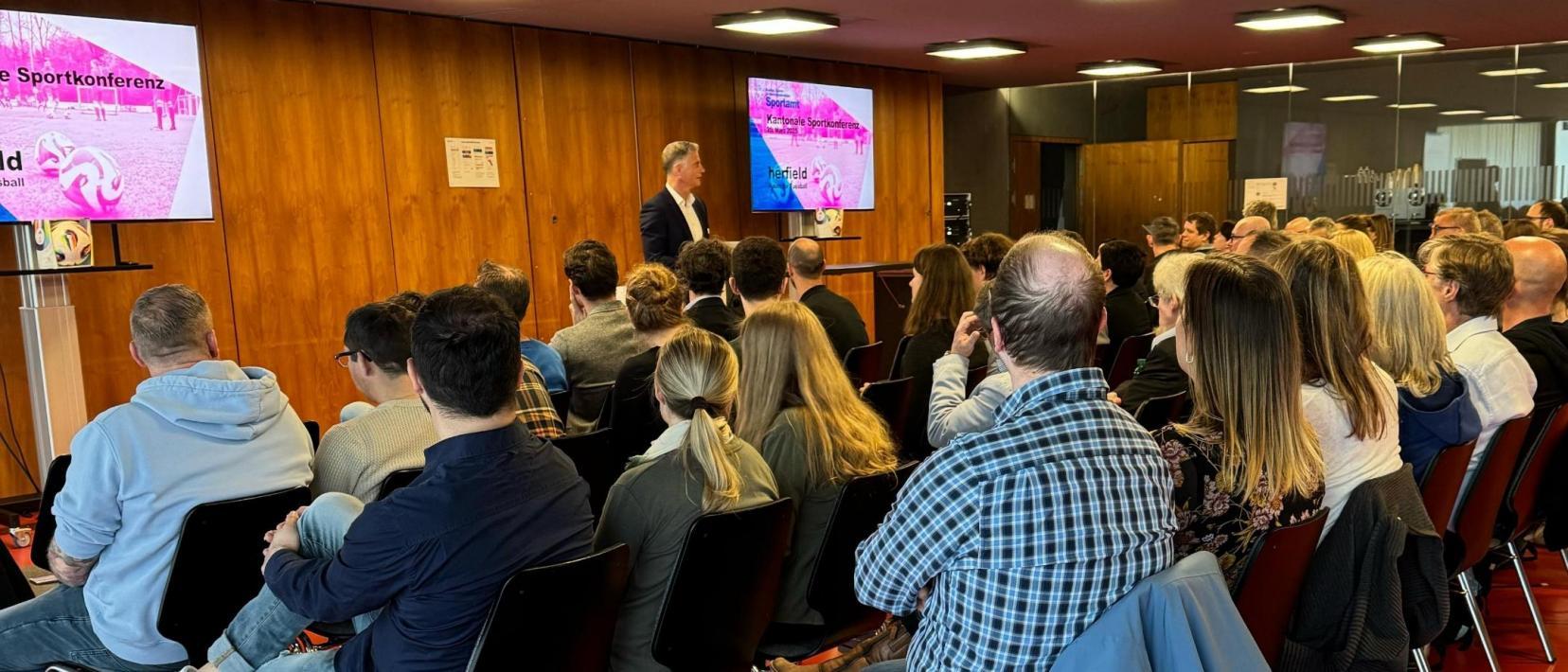 An der kantonalen Sportkonferenz am Donnerstag, 20. März 2025 setzten sich rund 80 Vertreterinnen und Vertreter aus Gemeinden und Städten unter dem Motto «herfield» mit der UEFA Women’s EURO 2025, deren Begleitmassnahmen und der optimalen Nutzung von Fussballplätzen auseinander.