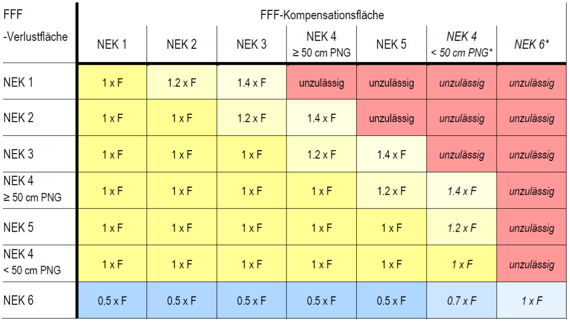 FFF-Verluste sind grundsätzlich qualitativ gleichwertig zu kompensieren; eine ungleichwertige Qualität kann durch eine grössere Fläche nach folgendem Schema ausgeglichen werden: