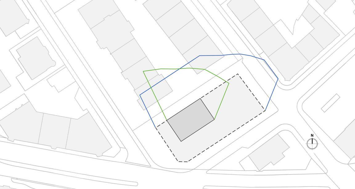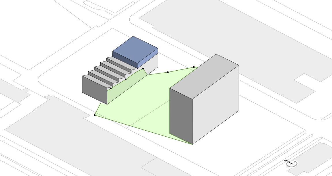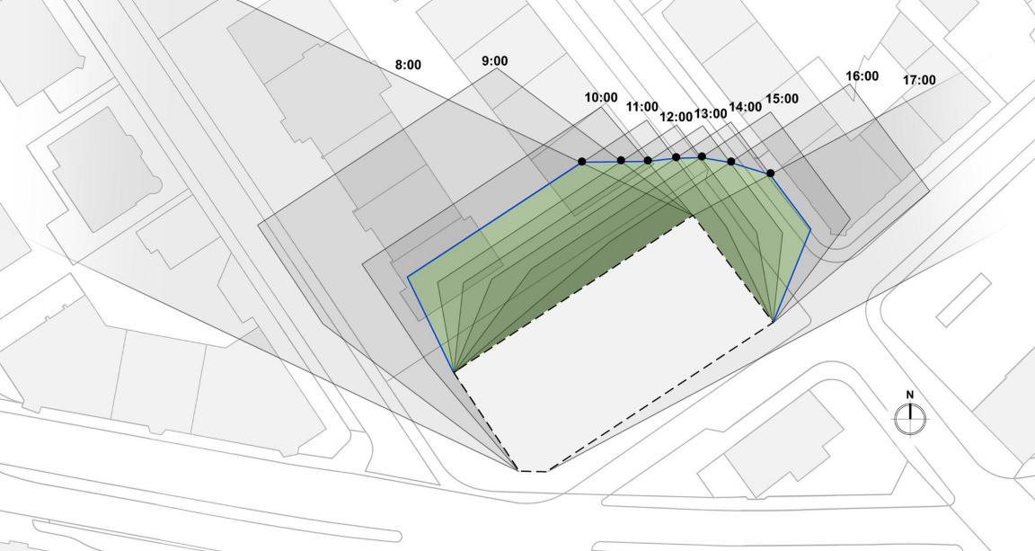 Anschliessend wird das 3-Stunden-Schattendiagramm des kubischen Vergleichsprojekts mit jenem des Hochhauses verglichen. Dazu werden beide Schattendiagramme überlagert.