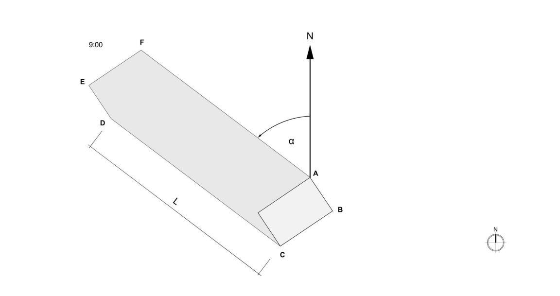 Um den Schattenwurf einer Tagesstunde zu ermitteln, wird von jeder Ecke des genordeten Grundrisses aus die Schattenlänge (L) im Sonnenwinkel (α) eingezeichnet. Der Schattenwurf ergibt sich durch das Verbinden der äusseren Punkte (ABCDEF) der eingetragenen Linien.