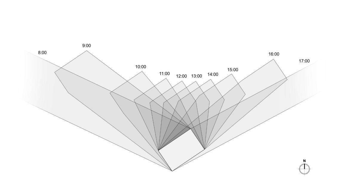 Diese Schritte werden für jede Stunde von 8 bis 17 Uhr wiederholt. Es resultieren insgesamt zehn Schattenbilder, wobei der erste Schatten im Westen und der letzte Schatten im Osten zu liegen kommt.