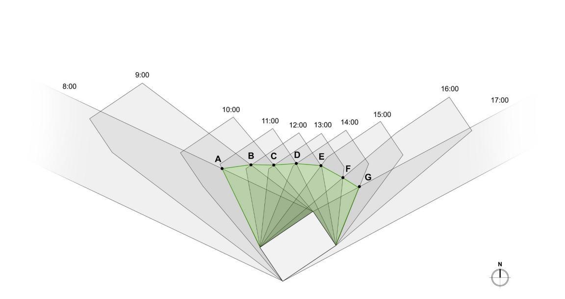 Für die Ermittlung des 3-Stunden-Schattens werden anschliessend die Schnittpunkte der einzelnen Schatten in 3-Stunden-Intervallen bestimmt, also die Schnittpunkte der Schatten um 8 Uhr und um 11 Uhr (A), um 9 Uhr und um 12 Uhr (B) usw. Danach werden die ermittelten Schnittpunkte miteinander verbunden. Anfang- und Endpunkt der entstehenden Linie werden mit den äussersten Punkten des Grundrisses verbunden (ABCDEFG). Es resultiert das gesuchte 3-Stunden-Schattendiagramm.