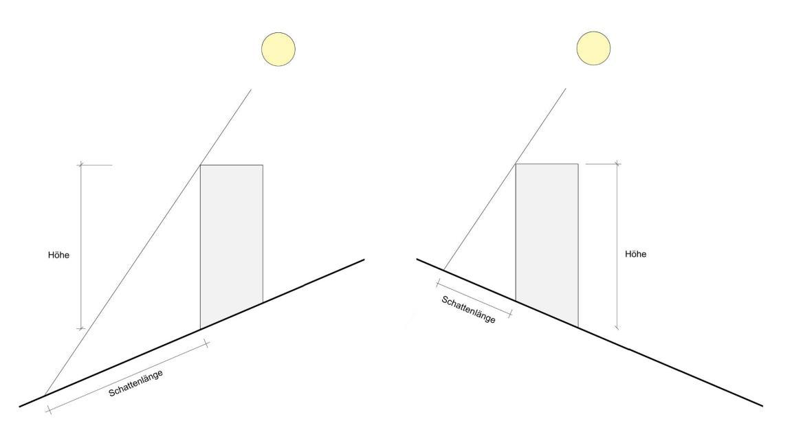 Anhand des Sonnenwinkels (α) und des Höhenwinkels (β) kann die Schattenlänge (L) sowohl grafisch wie auch mathematisch bestimmt werden.