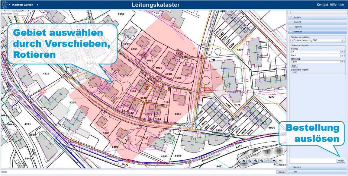 Option zum Bestellen von Daten im Portal. Quelle: ARE Klicken Sie auf «Box» oder «Polygon», um das gewünschte Gebiet zu markieren. Sie können das Gebiet verschieben und rotieren.