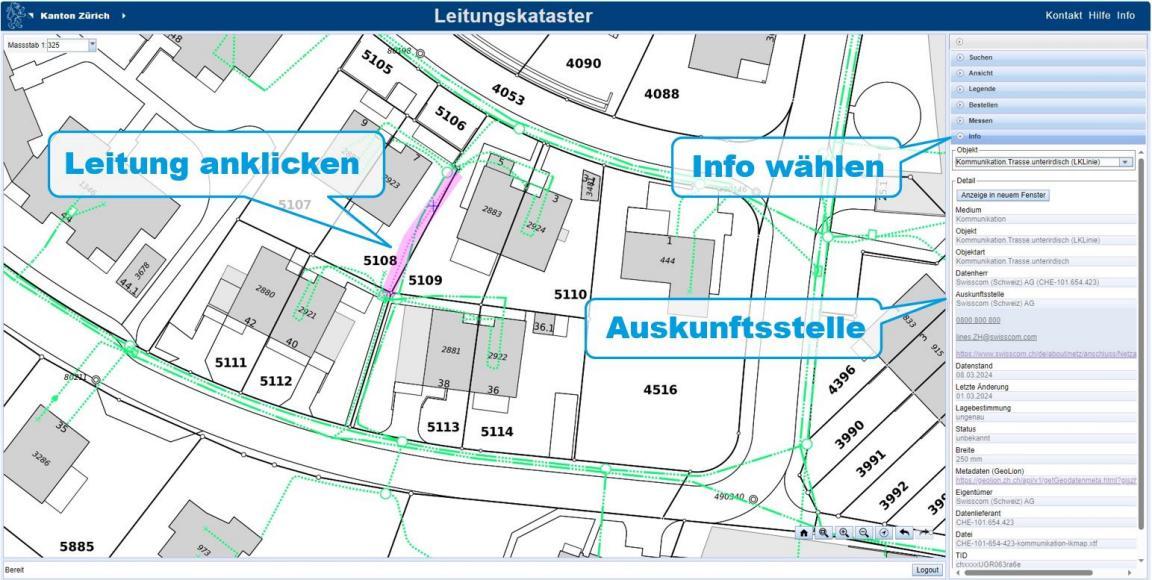 Welche Art von Leitung ist es, und wem gehört sie? Antworten auf diese Fragen erhalten Sie, wenn Sie im Menüpunkt «Info» auf eine Leitung im Kartenfenster klicken. Im Untermenüpunkt «Detail» werden die Objektinformationen angezeigt, u.a. die Auskunftsstelle.