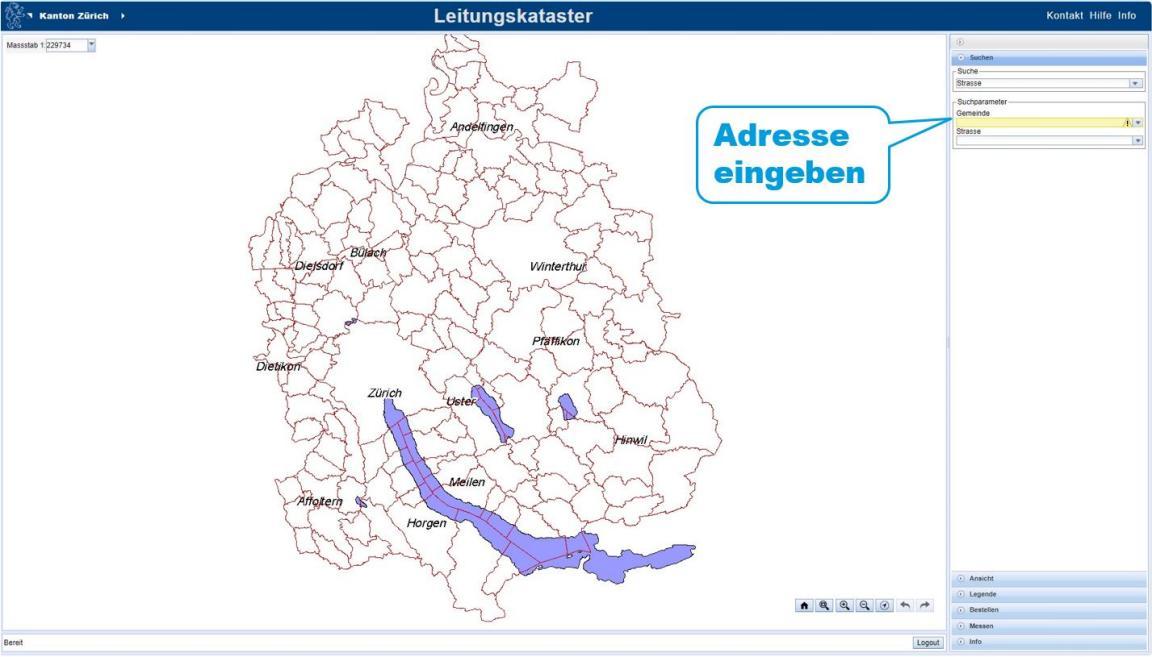 Nutzen Sie die Suchfunktion oben rechts in der Menüauswahl. Dort können Sie nach Gemeinden, Parzellen und Strassen suchen. Wenn Sie z.B. eine Strasse ausgewählt haben, wird diese im Kartenfenster angezeigt.