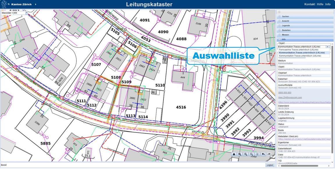 Darstellung der Möglichkeiten zur Anzeige von Informationen im Portal. Quelle: ARE Sind an der abgefragten Stelle mehrere Leitungen vorhanden, können Sie im Menüpunkt «Info» unter dem Untermenüpunkt «Objekt» überlagerte Leitungen in einer Liste einzeln auswählen.
