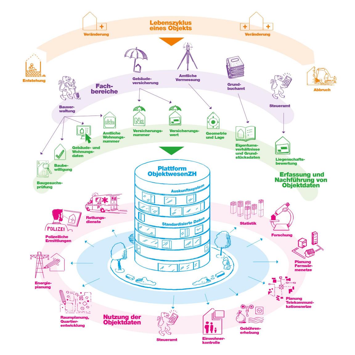 Verfolgt wird die langfristige Vision, dass alle Prozesse und Meldeflüsse in Verbindung mit Grundstücken und Gebäuden digitalisiert, standardisiert und medienbruchfrei über das zentrale System «ObjektwesenZH» zusammengefasst werden sollen.