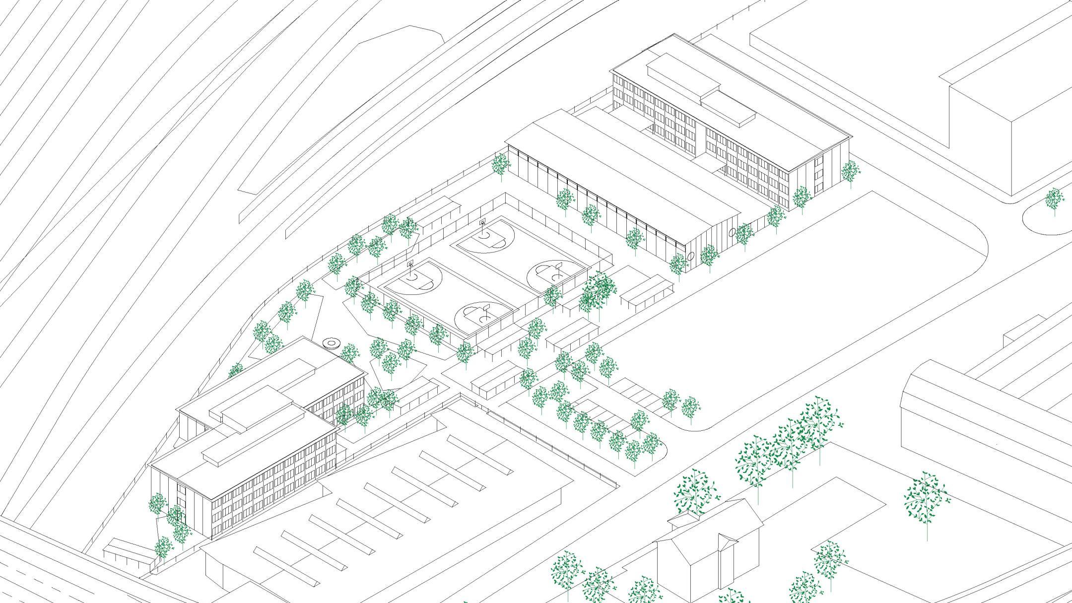 Das Provisorium setzt sich aus zwei Schultrakten und einem Sporthallentrakt mit zwei Einfachhallen zusammen. Neben 18 Klassenzimmern für den allgemeinen Unterricht beinhalten die Schultrakte Fachräume und Infrastrukturen für die naturwissenschaftlichen Disziplinen, Bildnerisches Gestalten und Musik, sowie zwei Mehrzweckräume und eine Mediothek. Im Freiraum entstehen ein Sport-Allwetterplatz sowie Aufenthaltsbereiche mit Pausenflächen, die öffentlich zugänglich sind.
