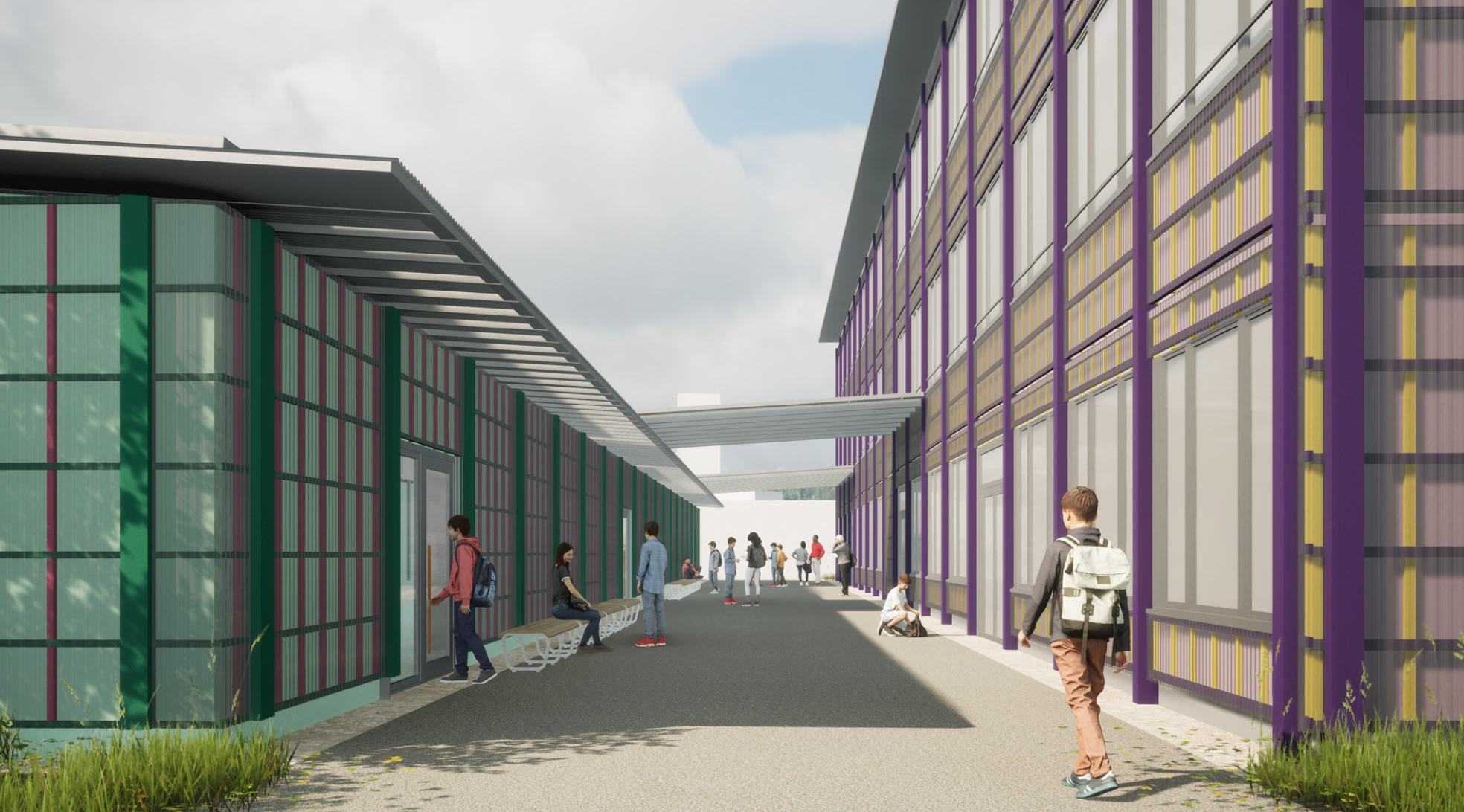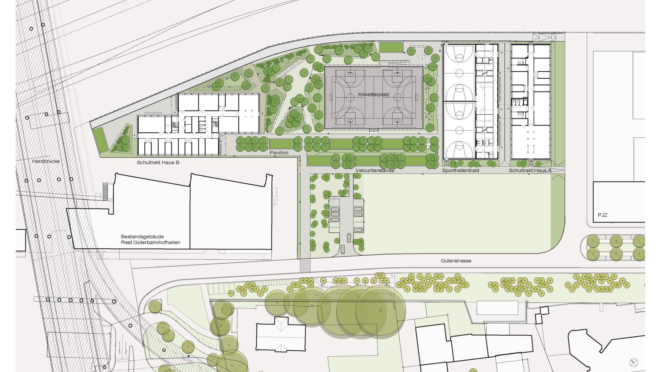 Auf dem Areal des ehemaligen Güterbahnhofs in Zürich entsteht in direkter Nachbarschaft zum Polizei- und Justizzentrum Zürich (PJZ) ein Schulraumprovisorium für 650 Schülerinnen und Schüler als Filiale der Kantonsschule Wiedikon.