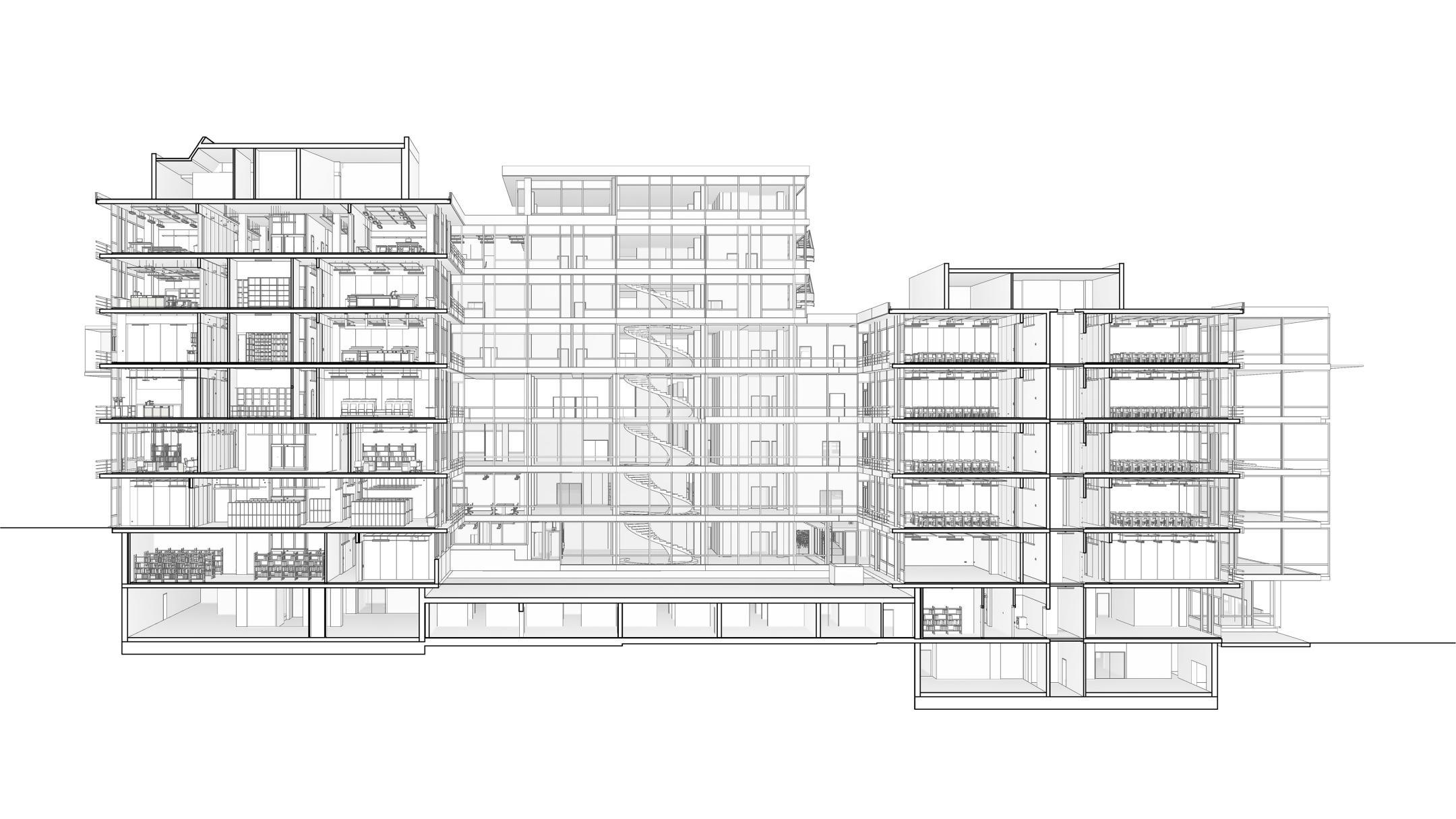 Die Schadstoffbelastung sowie die umfangreichen Umbauten erfordern einen Rückbau auf den Rohbau. Vertikale Erschliessungen wie Treppenhäuser und Steigschächte bleiben dabei weitgehend bestehen. In den öffentlichen Zonen der Fakultätsachse werden die Eingriffe auf die gesetzlich notwendigen Anpassungen beschränkt. Denkmalpflegerisch schützenswürdige Elemente wie hölzerne Wandverkleidungen, Bodenbeläge und Deckenleuchten werden nicht verändert.