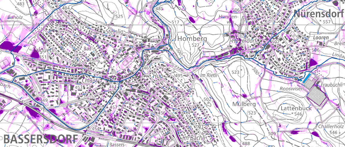 - Verfeinerte Daten: Fliesstiefen und -richtungen lassen sich ich nun für verschiedene Jährlichkeiten gezielt anzeigen (P30, P100, P300, P1000)
