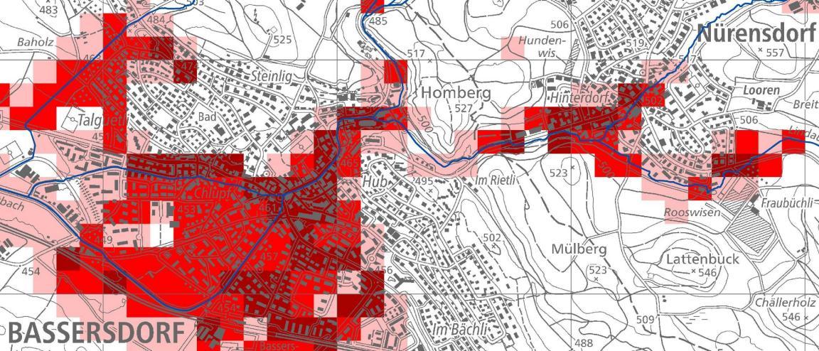 Die Berechnungen sind in 100-Meter-Kacheln zusammengefasst und zeigen aus grosser Flughöhe Gebiete, die keines, ein geringes, ein mittleres oder ein hohes Risiko aufweisen.
