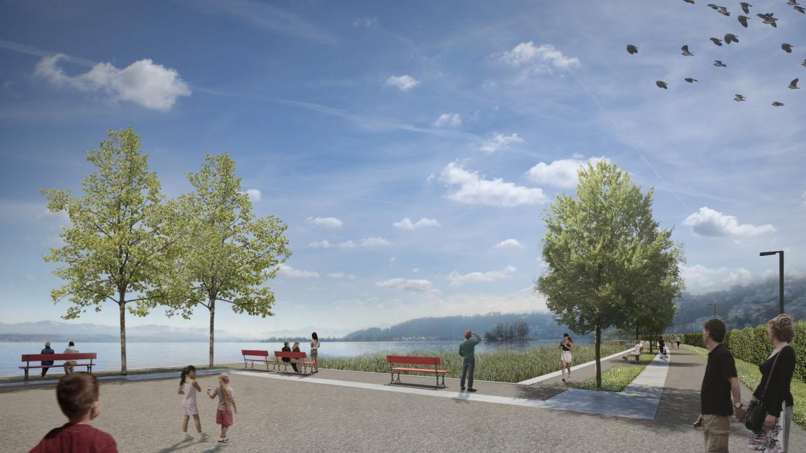 Die steile, steinige Uferbefestigung entfernt, das Ufer abgeflacht und Schilf angepflanzt – so kann sich ein ökologisch wertvoller Lebensraum entwickeln, wie er am Zürichsee nur noch selten vorkommt. Vögel und Fische finden Brut und Laichplätze, Sitzstufen bieten Zugang zum Wasser und neue Holzbauten laden ein, die Natur zu beobachten oder den Seeblick zu geniessen.