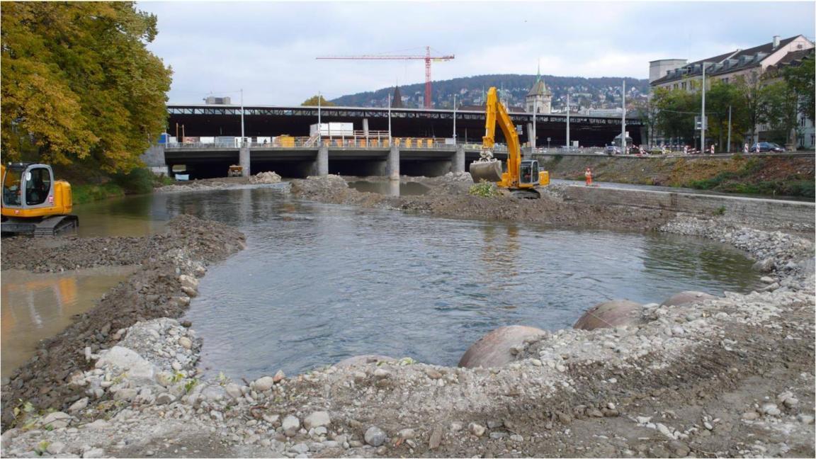 Ausbaggerungen der Flusssohle und Änderung der Pfeilerkonstruktion der Rathausbrücke zur Erhöhung der Abflusskapazität der Limmat.