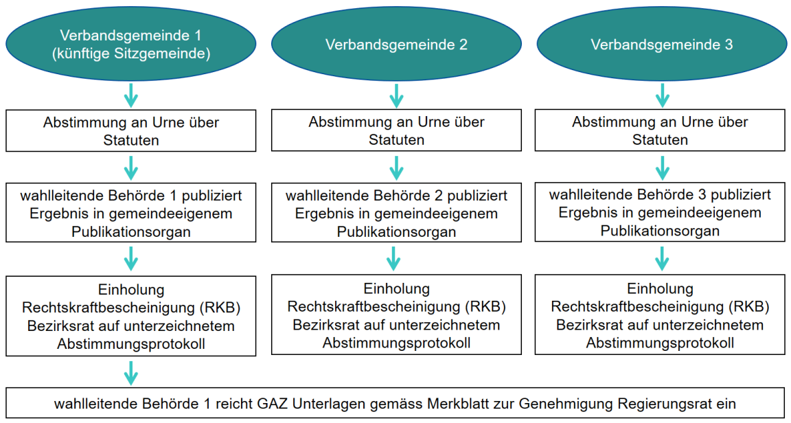 Bei der Gründung eines Zweckverbands finden die Abstimmungen in den einzelnen Verbandsgemeinden statt. Die jeweiligen wahlleitenden Behörden der Verbandsgemeinden publizieren ihr Ergebnis im gemeindeeigenen Publikationsorgan und sie holen die Rechtskraftbescheinigung beim zuständigen Bezirksrat ein. Die wahlleitende Behörde der inskünftigen Sitzgemeinde reicht anschliessend die Unterlagen zur Genehmigung durch den Regierungsrat beim Gemeindeamt ein.
