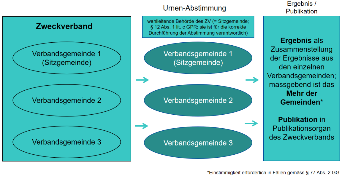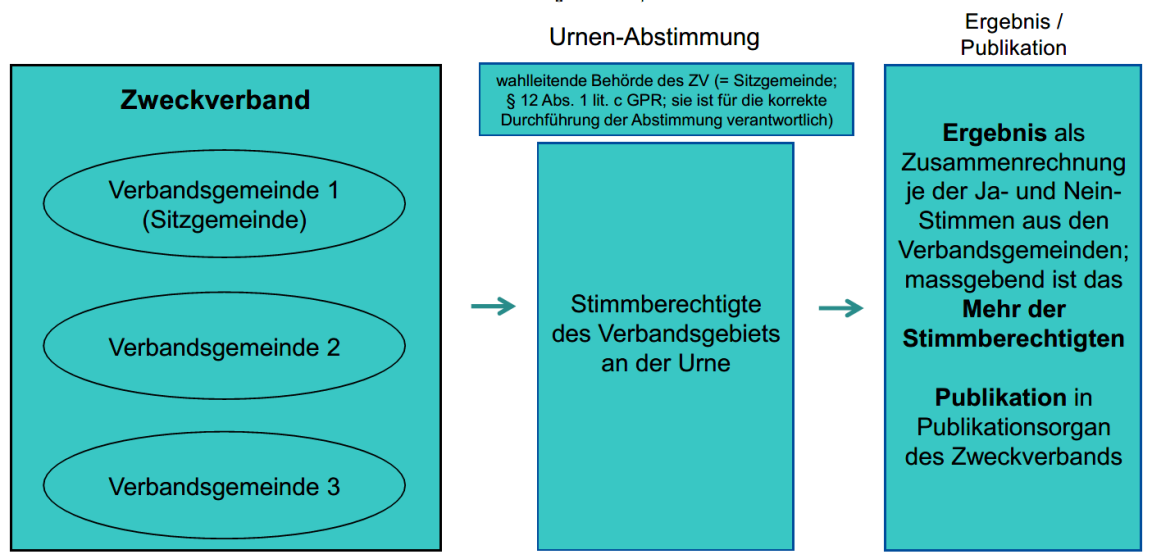 Bei Abstimmungen, die einen Zweckverband betreffen und an der Urne stattfinden, ist zu differenzieren: Je nach Geschäft sind das Gebiet, in dem die Abstimmung stattfindet, und das Verfahren anders.