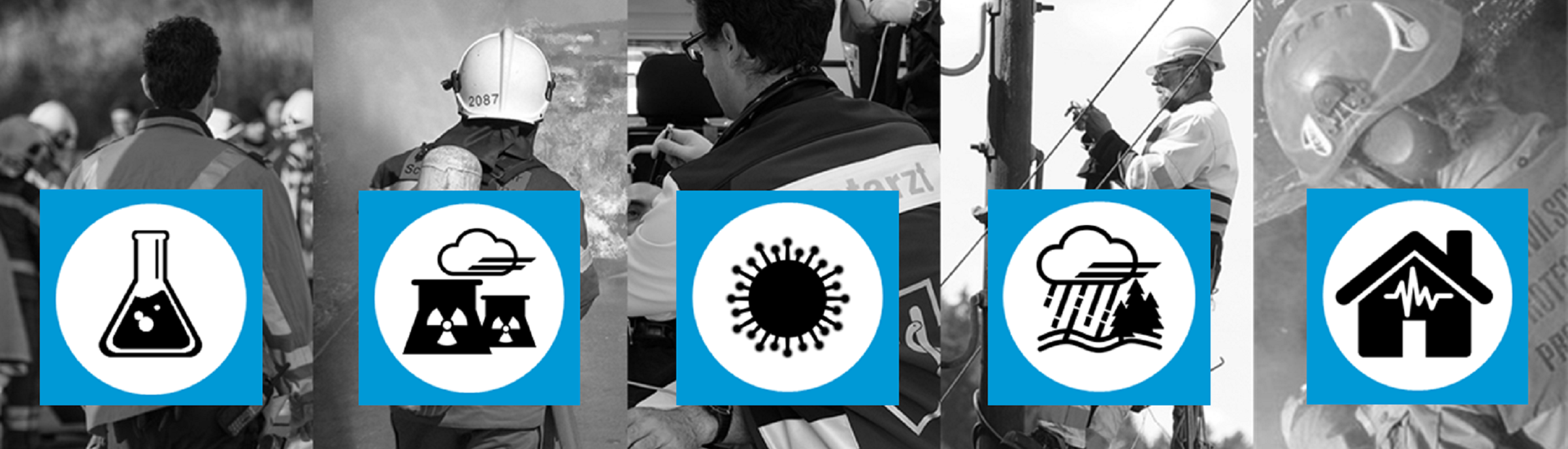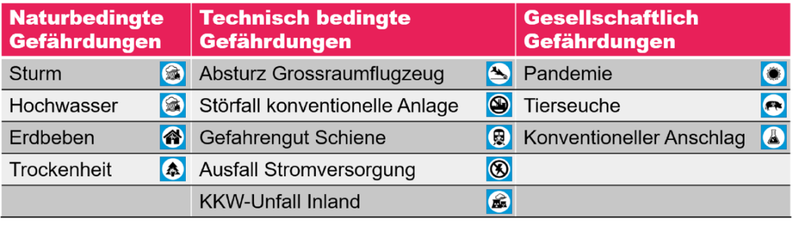 - Technik: Ausfall Stromversorgung, Ausfall Informations- und Kommunikationstechnologie, Flugzeugabsturz, Versagen einer Stauanlage, Unfall in einem Kernkraftwerk und Gefahrgutunfall im Schienenverkehr