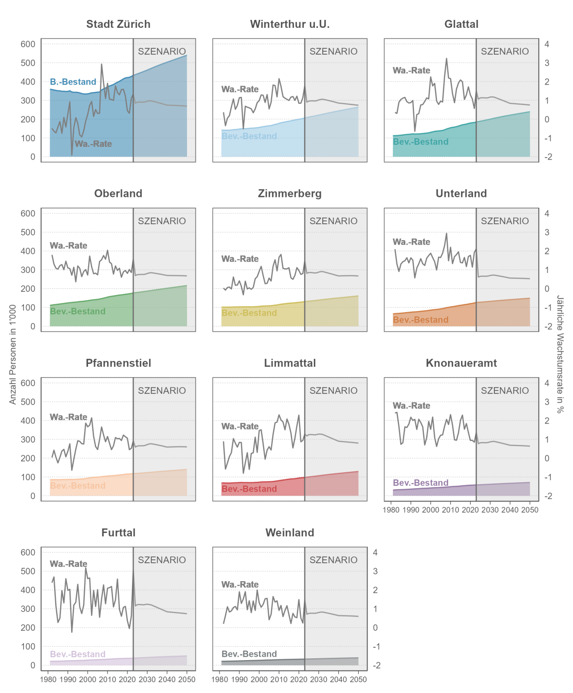 Bezogen auf den absoluten Bevölkerungsbestand werden urbane Gebiete wie die Stadt Zürich mit Abstand am meisten zulegen (+ 66'000 Personen), gefolgt vom Raum Winterthur (+ 38'000 Personen) und dem Oberland (+ 37'000 Personen). Am wenigsten wird die Einwohnerzahl im Weinland (+8'000 Personen) und im Furttal (+12'000 Personen) zunehmen.