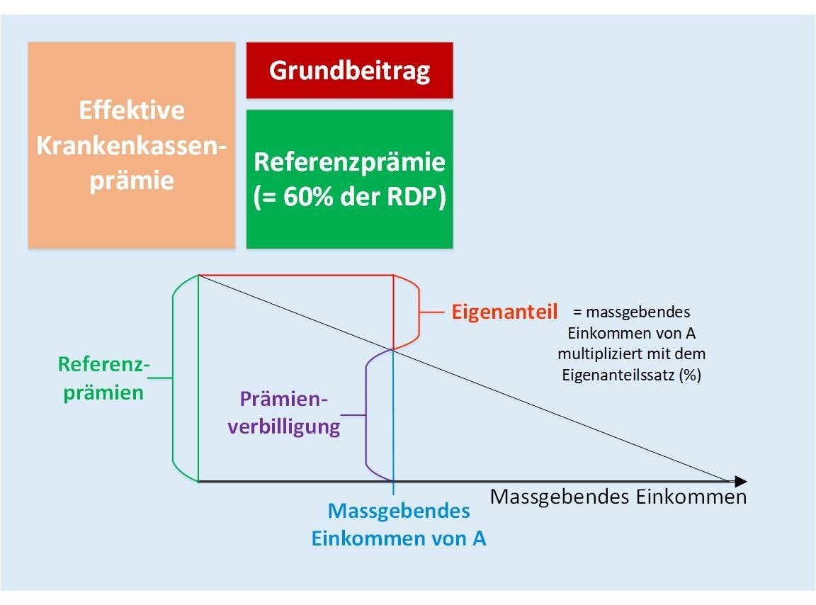 Der Grundbeitrag ergibt sich aus der Differenz zwischen der Referenzprämie und dem Betrag der individuell geschuldeten Krankenkassenprämie. Die Referenzprämie beträgt 60% der regionalen Durchschnittsprämie (RDP; § 4 Abs. 1 EG KVG, § 3 VEG KVG). Die RDP ist der gewichtete Durchschnitt aller Krankenkassenprämien mit tiefster Franchise (Standardprämien). Sie wird vom Bundesrat bzw. vom Eidgenössischen Departement des Innern (EDI) jährlich für die drei Prämienregionen des Kantons Zürich je für Kinder, für junge Erwachsene und für (ältere) Erwachsene festgelegt (vgl. SR 831.309.1).