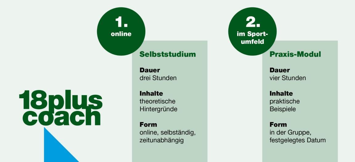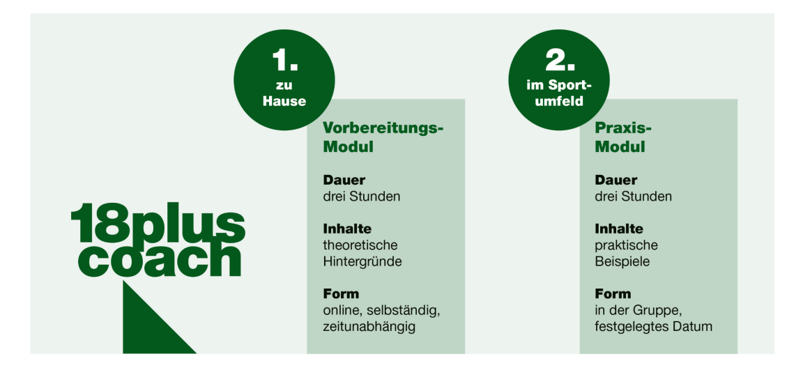 - 18plus coach richtet sich an Personen ab 18 Jahren ohne J+S-Ausbildung mit aktueller oder beabsichtigter Trainertätigkeit in einem Sportverein.