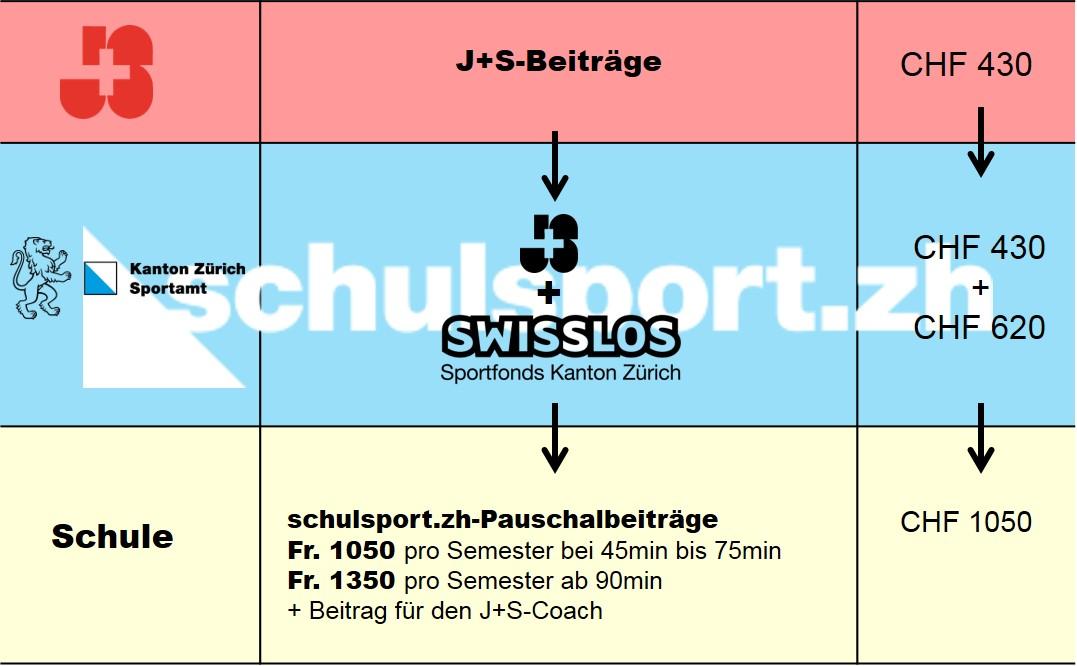 Die freiwilligen Schulsportkurse werden mit einem Pauschalbetrag unterstützt. Dieser Betrag setzt sich aus dem Beitrag von Jugend+Sport (J+S) und einem Beitrag aus dem kantonalen Sportfonds zusammen.