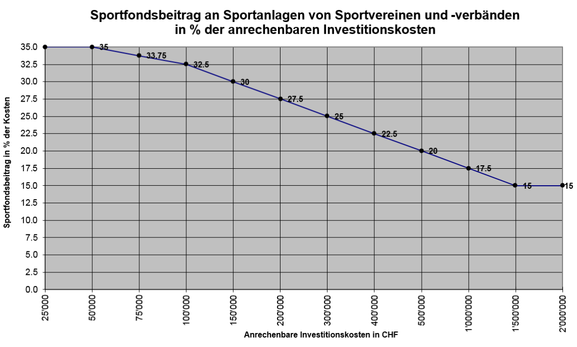 - Bei Anlagen von Sportvereinen oder -verbänden kommt ein Beitragssatz gemäss untenstehender Tabelle zur Anwendung.