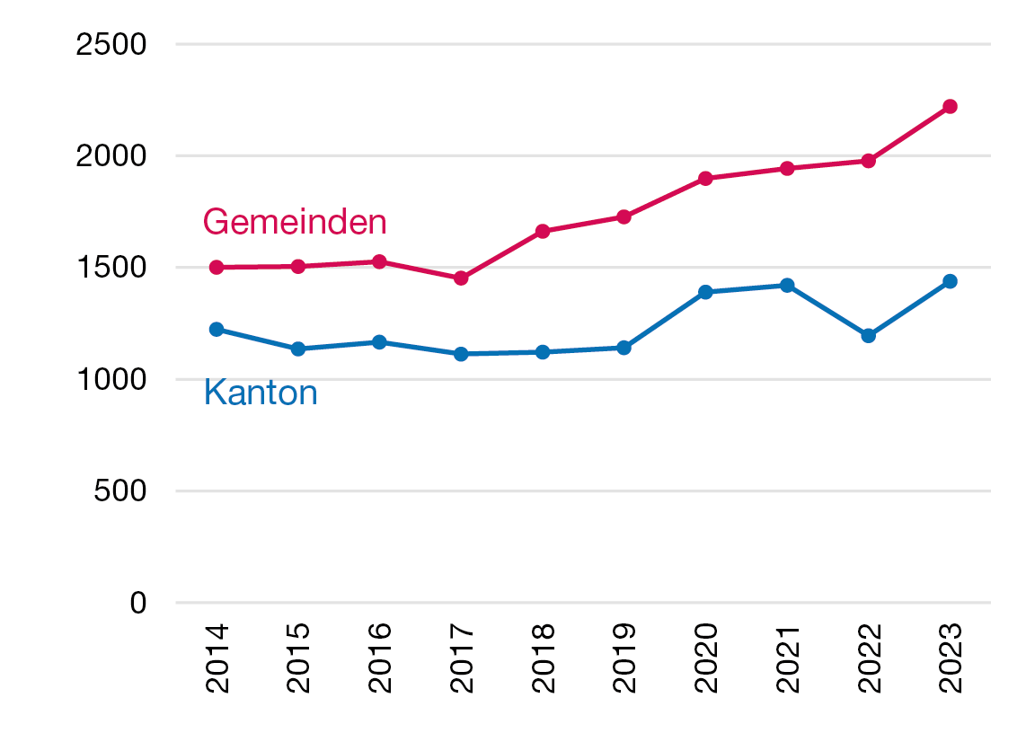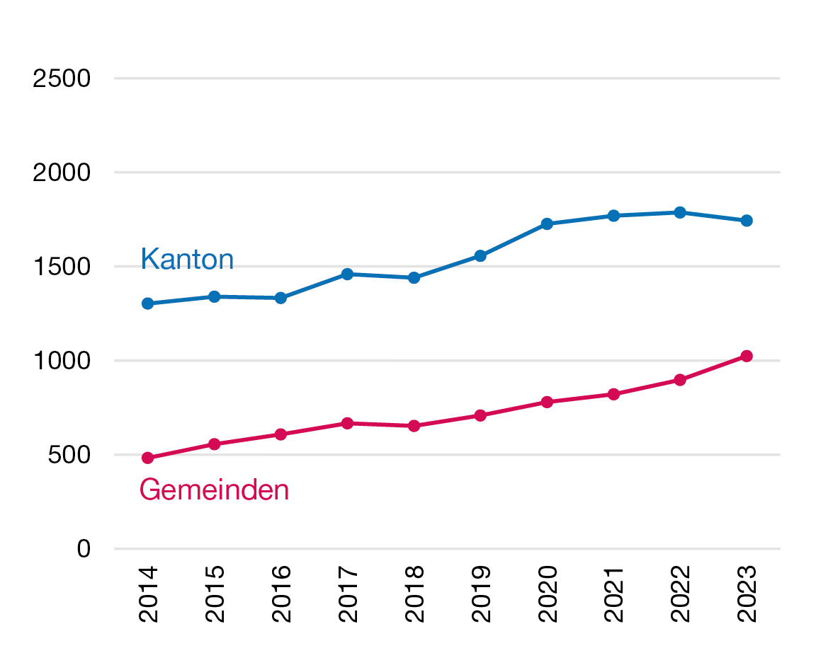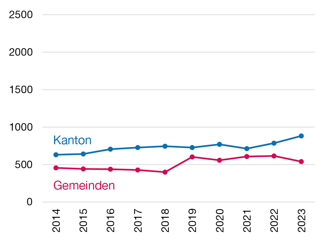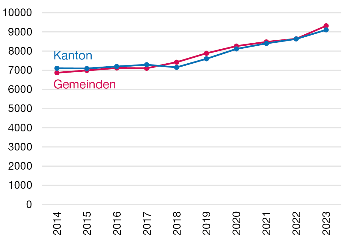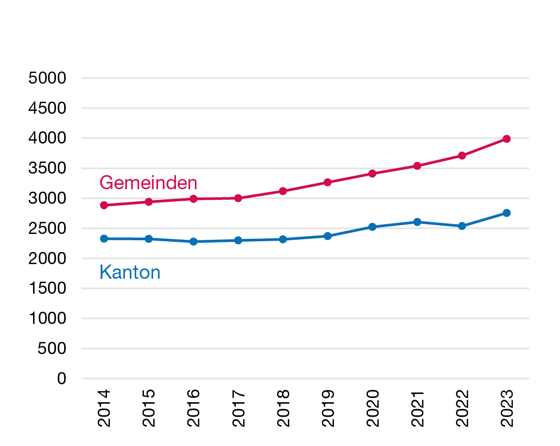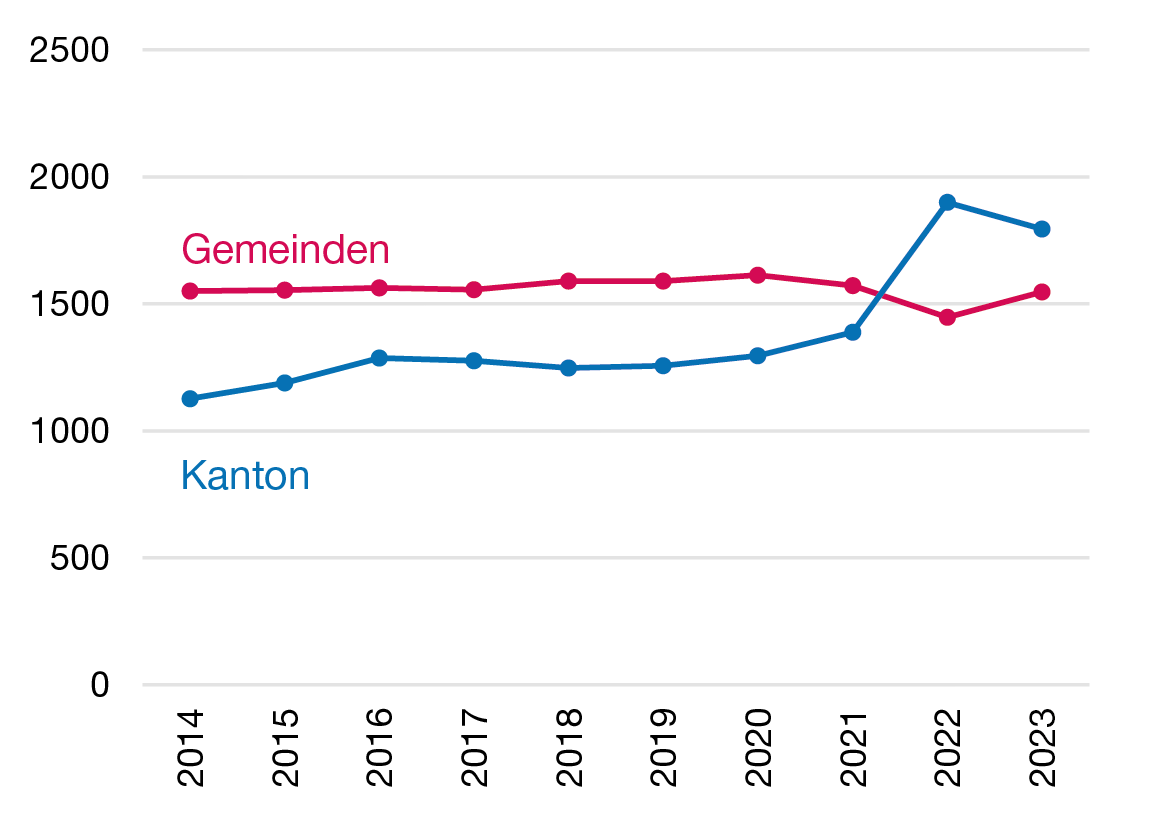 1 Werte bis 2018 nach harmonisiertem Rechnungslegungsmodell 1 (HRM1, Kanton näherungsweise), Werte ab 2019 nach HRM2, jeweils Hauptaufgabenbereiche 0 bis 7. Im Kanton sind bis 2018 Einlagen in Fonds im Eigenkapital gemäss HRM1 im Aufwand dargestellt. In den Gemeinden sind Abschreibungen bis 2018 gemäss HRM1 dem (nicht abgebildeten) Aufgabenbereich 9 Finanzen und Steuern zugeordnet.