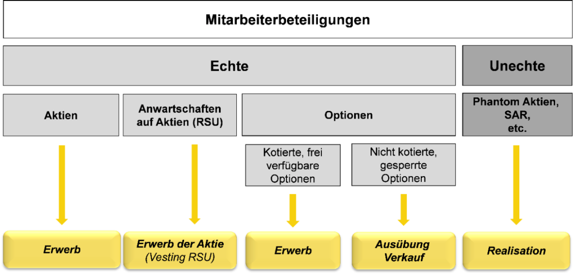 Wie bei den Mitarbeiteraktien gibt es frei verfügbare resp. gesperrte Mitarbeiteroptionen, entweder auf kotierten oder nicht kotierten Aktien.