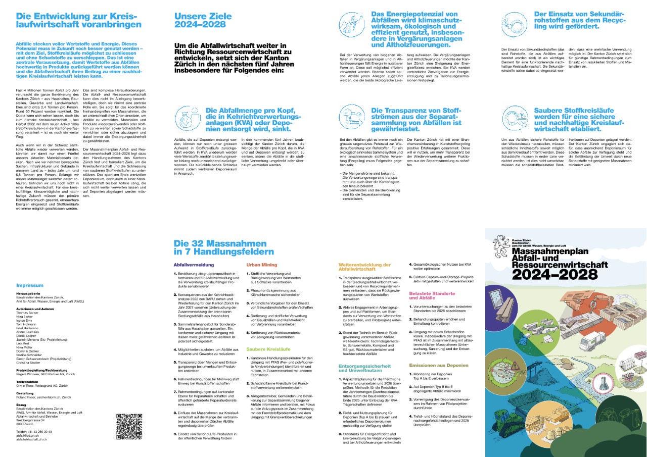 Der Kanton Zürich kann auf eine über 30-jährige, gezielte Entwicklung der kantonalen Abfall- und Ressourcenwirtschaft zurückblicken. Mit seiner aktualisierten Abfallplanung für die Jahre 2024 bis 2028 orientiert sich der Kanton Zürich zukunftsgerichtet an den Zielen der Kreislaufwirtschaft.