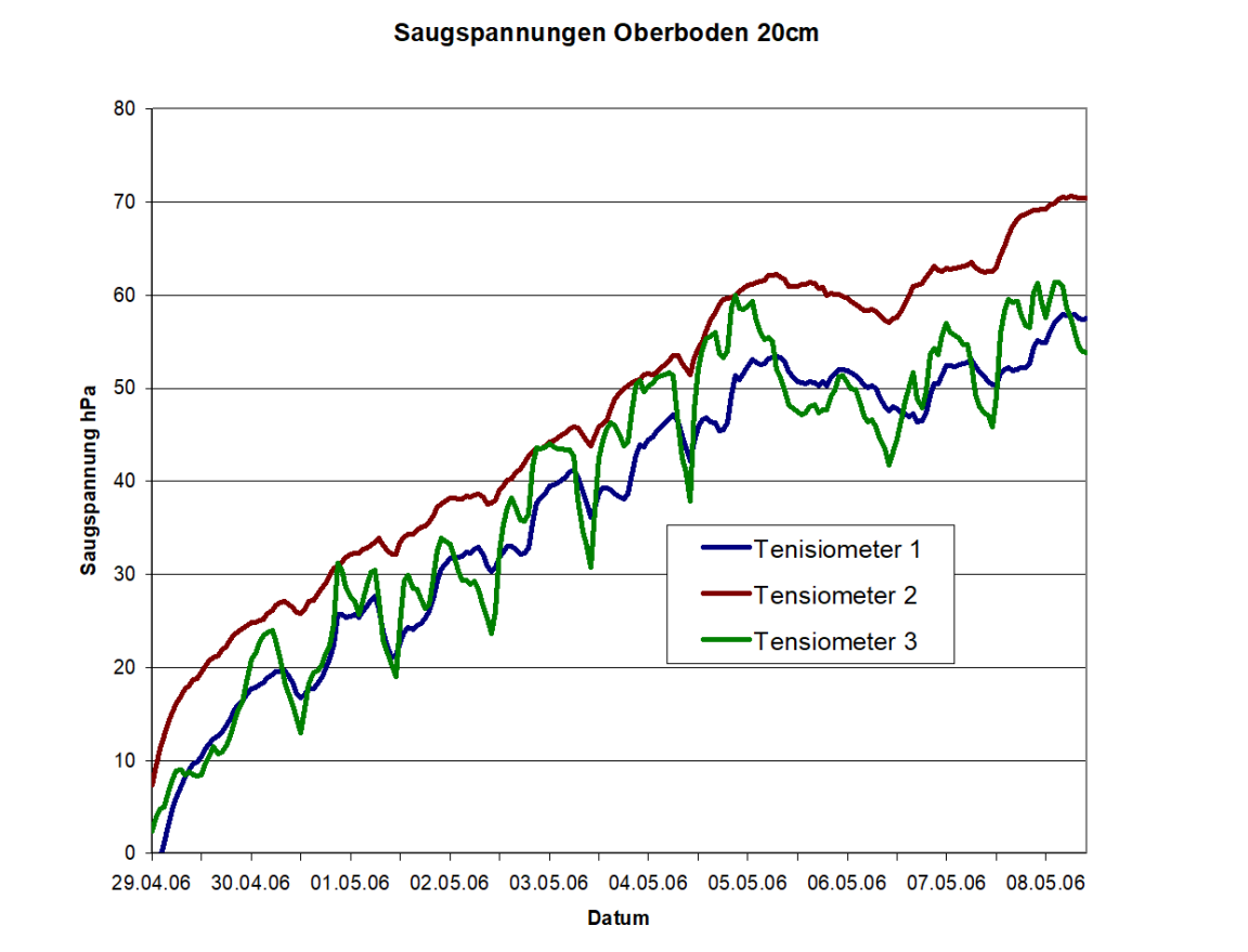 Physikalische Umwelteinflüsse ändern sich in Oberflächennähe rascher und stärker als in grösserer Bodentiefe. Die Wärmeeinstrahlung und der Wasserentzug durch Pflanzenwurzeln führen zu einem raschen Anstieg der Saugspannung in 20 Zentimeter Tiefe, während die Austrocknung in 40 und 70 Zentimeter Tiefe wesentlich langsamer und gedämpfter abläuft. Ein markanter Tagesgang macht sich erst nach der Entleerung der Grobporen bei rund 10 Zentibar in allen Bodenschichten deutlich bemerkbar.