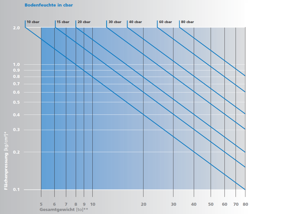 Die Beurteilung der Befahrbarkeit von Böden hat unter Einhaltung der Nomogrammwerte zu erfolgen. Die Einsatzgrenze für Maschinen lässt sich anhand der Bodenpressung, des Gesamtgewichts der Maschine und der vor Ort gemessenen Saugspannung berechnen: