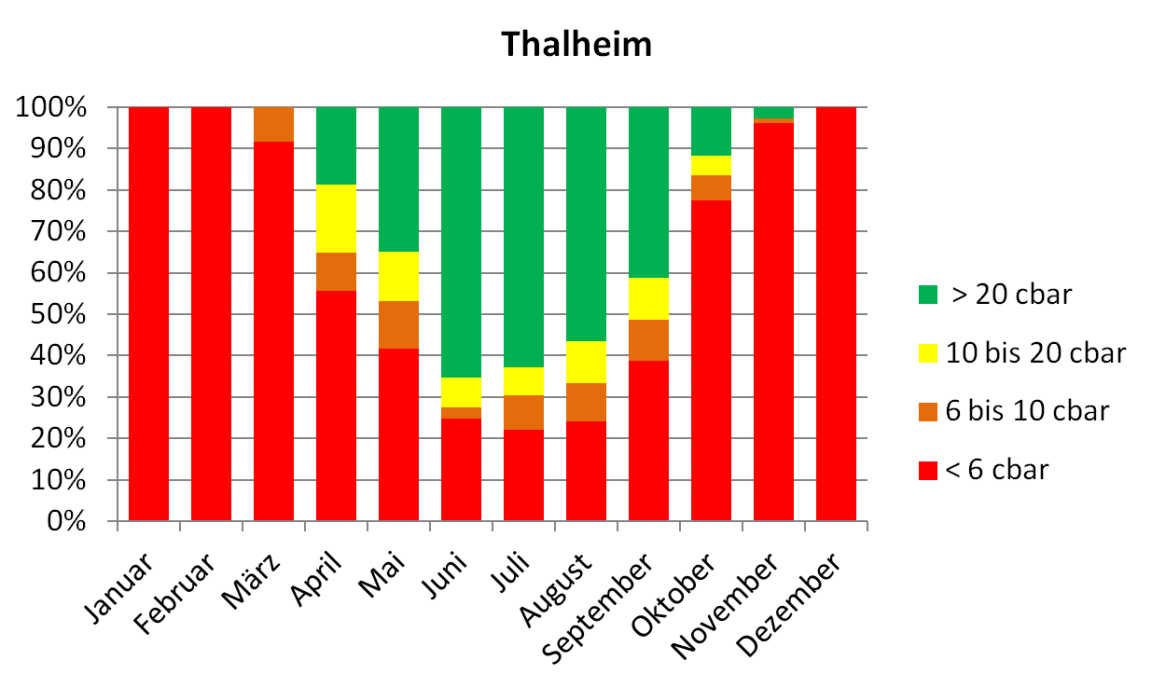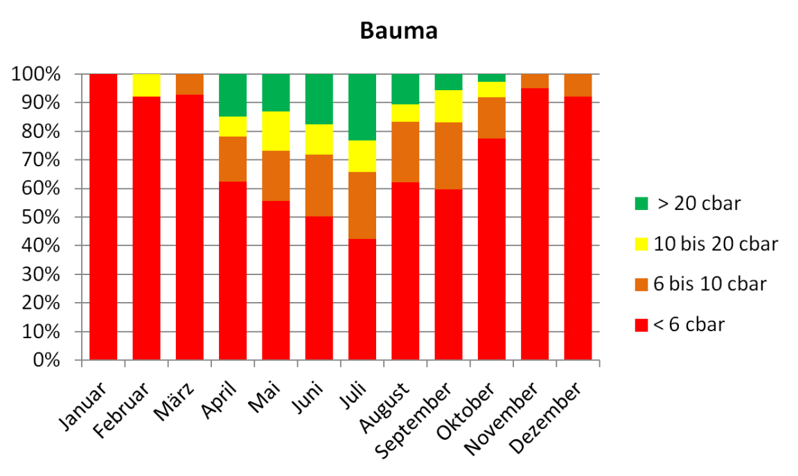 Optimale trockene Bedingungen (über 20 Zentibar) finden sich vorwiegend während der Vegetationsperiode von Mitte April bis Mitte Oktober. Im Winterhalbjahr sind die Böden für Bodenarbeiten meistens zu nass (unter 6 Zentibar).